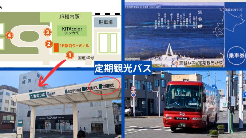 稚内の定期観光バスは午前Aコースと午後Bコースがあります(立ち寄る観光名所はほぼ共通です)。今回参加する午後Bコースは13時45分稚内駅前出発。